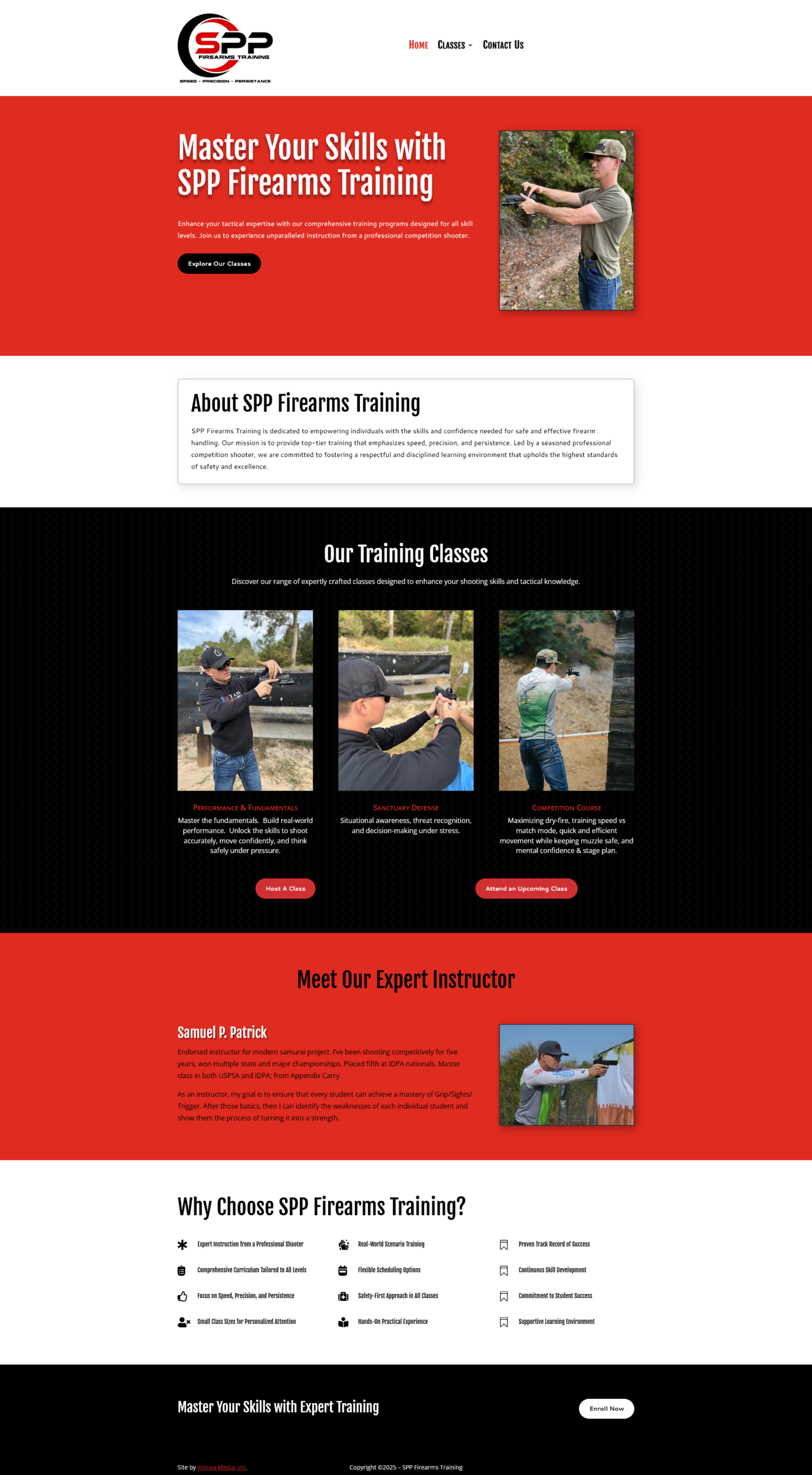 SPP Firearms Training engaged us to establish a professional and accessible online presence for their new business. The primary goals were to introduce their safety-focused training programs to the community, highlight the expertise of their instructors, and provide a seamless way for students to view course offerings and get in touch. We focused on creating a clean, authoritative design that reflects the brand’s commitment to safety, education, and professional responsibility.